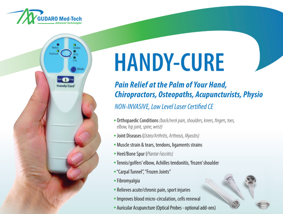 Handy-Cure Sâ„¢ is a compelling medical device (certified C.E. and FDA) based on the synergetic effects of 4 energy sources: LLLT (Cold Laser) + I.R. + static electromagnetic fields + red light for rheumatic & orthopaedic pain relief for HUMANS and Vet. Medicine (Horses, Dogs, Cats).