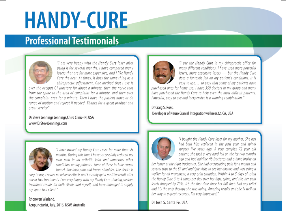 “I use the Handy Cure S in my chiropractic office for many different conditions. I have used more powerful lasers, more expensive lasers* — but the Handy Cure S does a fantastic job on my patient’s conditions. It is easy to use… so easy that some of my patients have purchased ones for home use. I have 350 doctors in my group and many have purchased the Handy Cure S to help even the most difficult patients. Powerful, easy to use and inexpensive is a winning combination.”