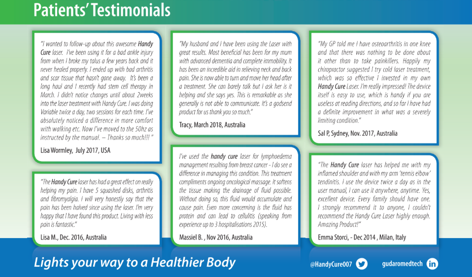 “I am very happy with the Handy Cure S laser after using it for several months. I have compared many lasers that are far more expensive, and I like Handy Cure S the best. At times, it does the same thing as a chiropractic adjustment. One method that I use is over the occiput C1 juncture for about a minute, then the nerve root from the spine to the area of complaint for a minute, and then over the complaint area for a minute. Then I have the patient move or do a range of motion and repeat if needed. Thanks for a great product and great service.”
